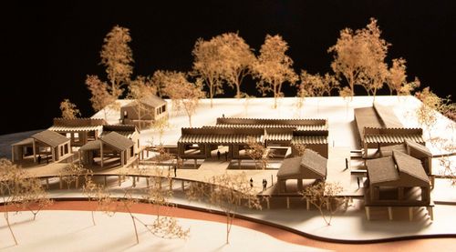 Maquette avec la passerelle et les différentes typologies de logement proposées