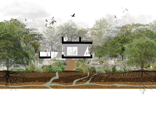 En se mettant à distance nous mettons en valeur ce sol. Le projet se construit sur pilotis, au travers de la constitution d'une passerelle habitée, soit en sous face de la passerelle, à 4 mètres du sol, soit au niveau même de cette passerelle, à 7 mètres ou en sur hauteur. Cette ligne de 380 m de long devient alors un cheminement aérien qui permet de découvrir et franchir ce monde du vivant.