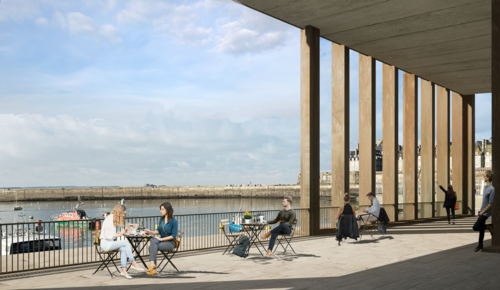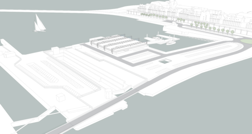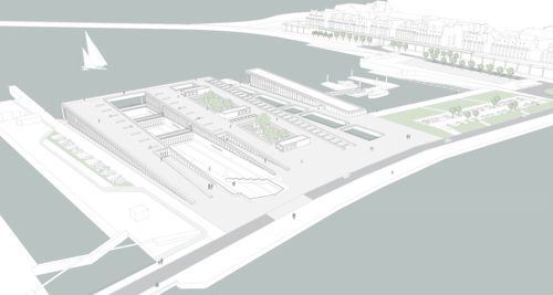 L'élaboration des volumes est douce, afin de mettre en valeurs les axes forts du lieu : Intra-Muros, La cale sèche et le bassin de remplissage. L'idée est de redonner ce territoire aux Malouins, en créant une toiture colossale, servant de place publique. L'échelle démesurée de cette dernière créer un espace de respiration permettant de contempler la beauté du port, de la ville, et de la mer. De larges espaces bruts offrant une vue poétique sur le paysage Malouin.