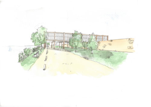 Croquis aquarelle d'une vue depuis le chemin de halage au sud du terrain