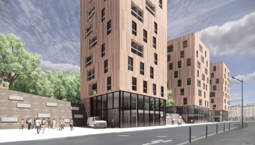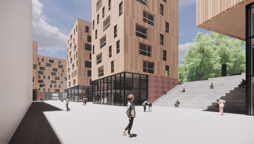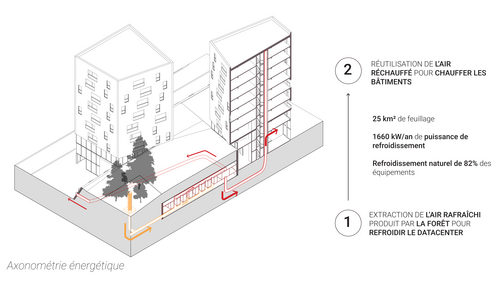 Cette plateforme se veut poreuse vis à vis de son contexte urbain, et dont les interstices entre les bâtiments périphériques amènent une vie au cœur du projet et de sa grande forêt (dont les capacités de production de fraîcheur refroidissent un datacenter en sous sol, au profit du quartier). Une topographie ascendante vers la Seine aboutit sur un pôle public et son parvis, offrant une vue privilégiée. Chaque espace de fabrication (accessibles depuis les logements) dispose enfin d'un séquençage des activités de la production autour de son noyau structurel.