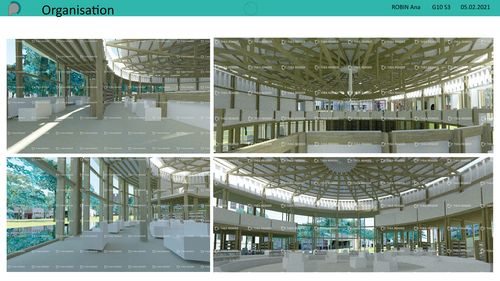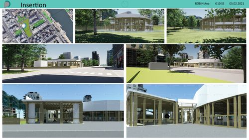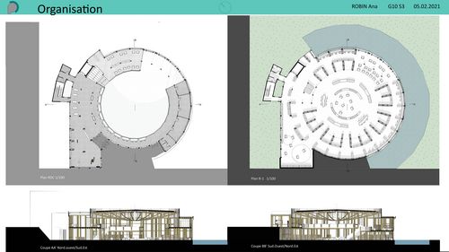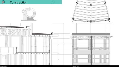 La Bibliothèque Robin réemploie la charpente en roue de vélo et à fermes lenticulaires de 28.80 m de portée du marché aux bestiaux de Cazis en Suisse, conçue par l'architecte H. Marugg en 1998.