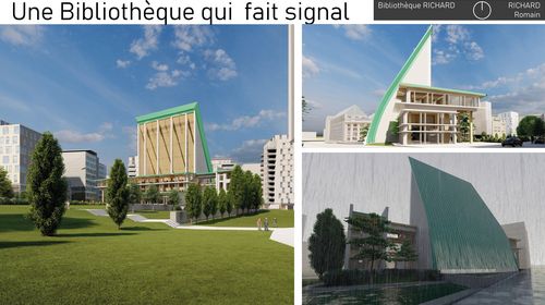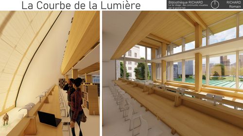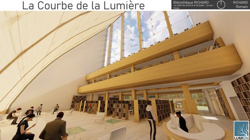 Pour qu’une lumière réfléchie sur une immense paroi revêtue de bois se diffuse généreusement dans les espaces de lecture toute l’année aux heures d’ouverture de la bibliothèque, il a fallu une implantation à l’angle nord-ouest du jardin de l’Abbé Pierre, une orientation plein sud et la mise en place d’un dispositif de captation des rayons solaires à hauteur des étages supérieurs des bureaux de l’Avenue de France.