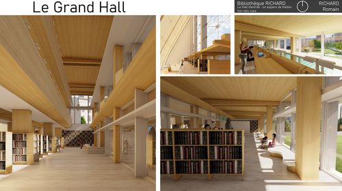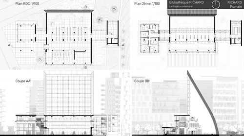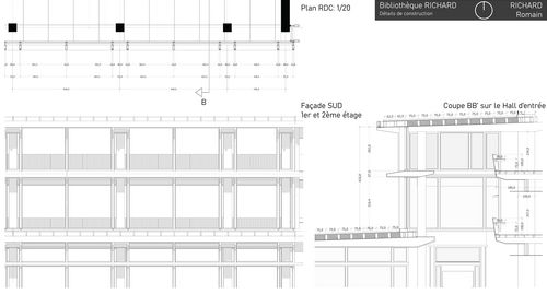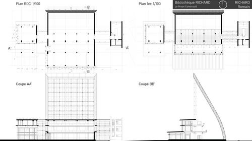 La bibliothèque Richard a réemployé une partie de la charpente d’un hangar de 38000 m2 réalisé à Yaoundé au Cameroun vers 1949 par Robert Le Ricolais. Nous disposons des poteaux et des nappes tridimensionnelles de module 3.20 par 3.20m réalisés selon le système APLEX.