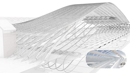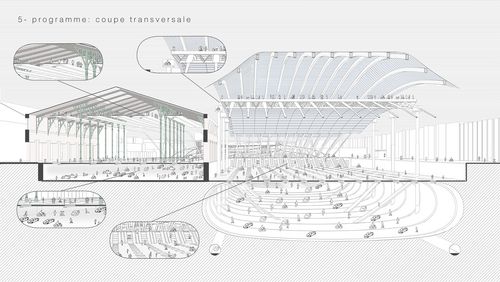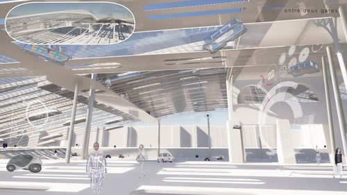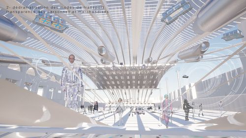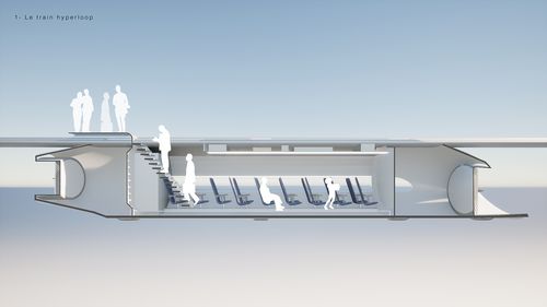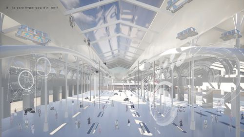 En 2070, les modes de transport se seront métamorphosés. Le train Hyperloop, roulant à une vitesse de 1.200 km/h, permettra de repenser l'espace des déplacements ultra-rapides après la fin de l'avion. L'accès au train par le haut, ainsi que l'éclatement des rails du train permet de repenser la gare comme grand espace commun fluide sur une nouvelle typologie de quai, une dalle trouée continue.