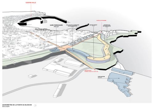 Ce projet de PFE avait pour objet la requalification du flanc EST de la ville de Roscoff, petite commune bretonne en bord de mer connaissant actuellement une perte de vitesse. Alors qu'à l'Ouest de la ville se trouve le centre historique, et donc par extension le centre touristique, l'Est de la ville est occupé par un quartier industriel, partagé entre un port en eau profonde et une zone d'activité.