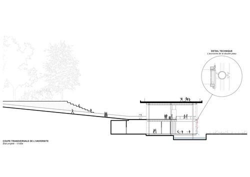 Projet architectural : Le principal enjeux de ce projet consistait à s'implanter dans un site ayant retrouver un caracter naturel, paysager, à dominante végétale. Ainsi le projet vient s'implanter le plus discrètement possible de façon à ne former qu'une ligne dans le paysage, marquant ainsi une transition entre la mer et la terre.