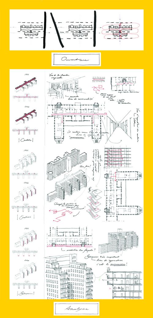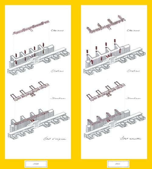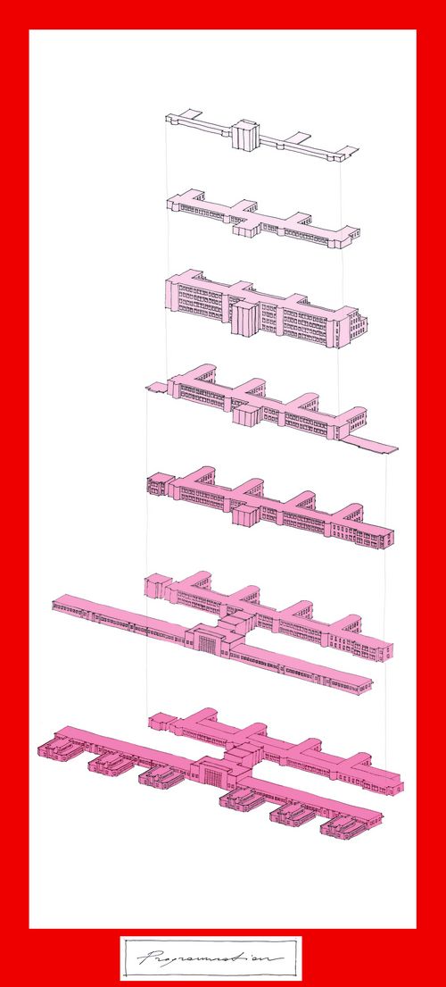 Le projet naît et se développe en travaillant sur deux problématiques fondamentales au sein de l'hôpital Beaujon : son articulation verticale et horizontale. La ligne horizontale est reconceptualisée uniquement à l'intérieur du bâtiment, en repensant la composition interne et en supprimant le couloir, par l'utilisation de la polychromie. La ligne verticale se développe à l'extérieur, en repensant les escaliers de secours qui, maintenant, défigurent la façade sud du bâtiment. La régénération tente de donner un nouveau visage et une nouvelle vie au géant monumental de briques.
