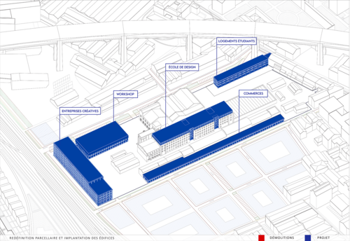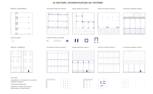 Ce projet de fin d'études explore les questions de valorisation et de transformation de l'existant à travers une intervention architecturale et urbaine dans un complexe industriel réinvesti. Il se traduit par une opération à trois échelles qui mêle différentes réflexions sur le désenclavement urbain, l'instrumentation d'un nouveau programme dans un principe de ville productive et enfin sur la pérennisation des édifices existants dans une logique de flexibilité et de réversibilité avec la transformation de l'édifice principal en une école supérieure de design industriel. Le projet vise alors à rendre compte et à enrichir la particularité foisonnante et super-dynamique du lieu choisi, aujourd'hui appelé la Lx factory.