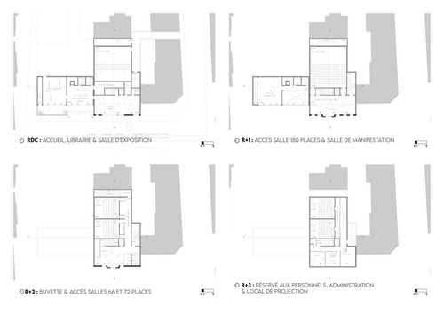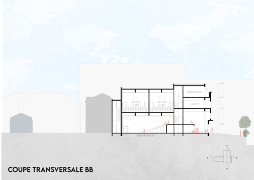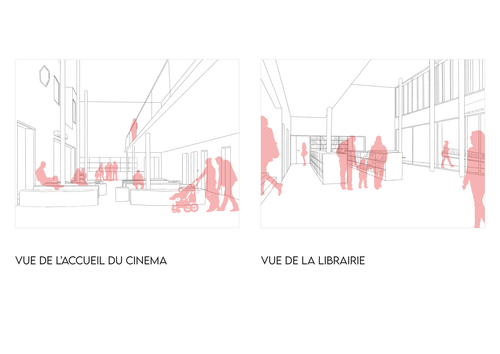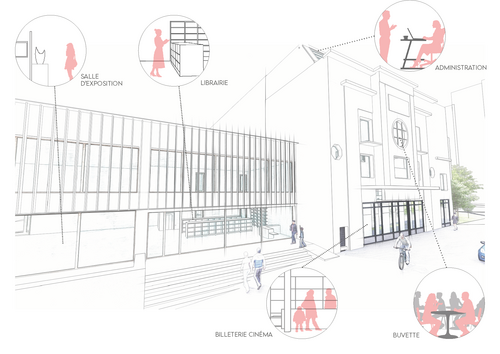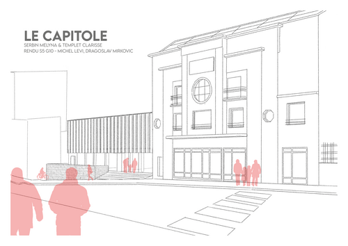 En conservant la façade d'origine, nous avons œuvré pour la conception d'un cinéma avec trois salles et d'un tiers-lieu. Le programme de ce projet est axé sur le cinéma et son histoire pour apporter une dimension culturelle. Il y a d'une part, une salle d'exposition, une librairie sur le cinéma et une salle de manifestation pour le tiers lieu et d'autre part, une buvette, une galerie d'affiches, trois salles de projection et une administration pour le Capitole.