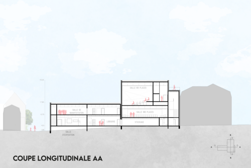 Quant au tiers-lieu, il présente en rez-de-chaussée une grande transparence avec de grandes baies vitrées pour que les piétons, depuis la rue, puissent voir en partie la salle d'exposition et la librairie. À l'étage supérieur se trouve des brises soleils contrôlant l'apport lumineux dans la salle de manifestation.