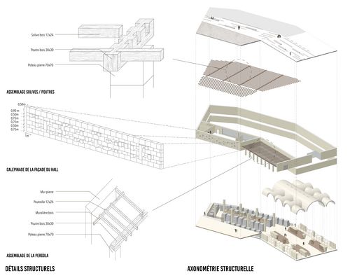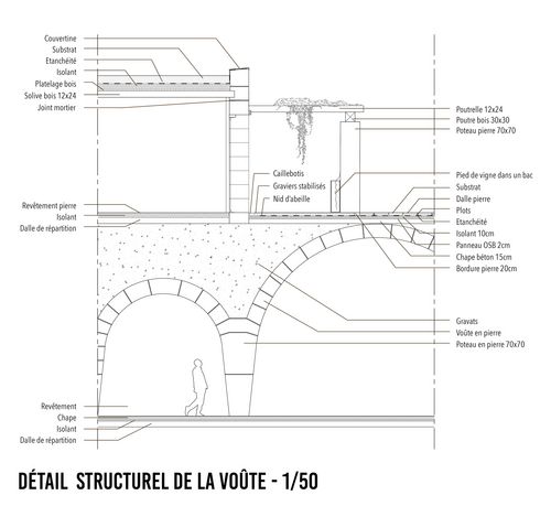 Par ailleurs, ce dernier use de matériaux locaux comme la pierre de Bourgogne ou le chêne, symbole de la confection des tonneaux bourguignon. Le visiteur est donc plongé dans l'ambiance d'un chai viticole en étroite relation avec son terroir.