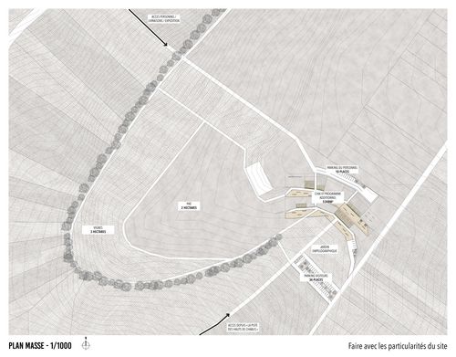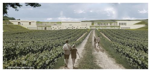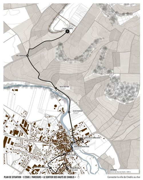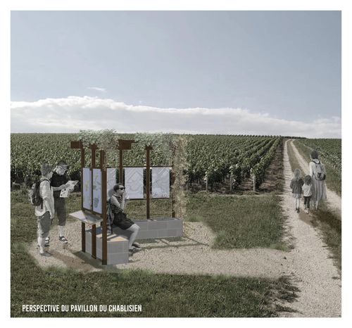 La future Cité des Vins et des Climats, dont l'ouverture est prévue pour 2022, instaure les prémices du tourisme viti-vinicole dans la région, notre chai s'inscrit donc dans cette volonté. En effet, le chai des " Hauts de Chablis ", se situant au milieu des vignes et des Grands Crus et surplombant la ville, développe à la fois un programme de production mais permet également aux visiteurs d'en apprendre davantage sur toutes les étapes de la fabrication du vin, de l'entretien et de la pousse de la vigne. Nous avons également eu la volonté de mettre en valeur le paysage, en connectant le centre-ville de chablis avec le chai, afin que les visiteurs arpentent le vignoble chablisien, mais également en proposant des circuits faisables à cheval. L'implantation de notre chai s'efface dans la pente naturelle du terrain, afin de mettre en valeur les vignes.