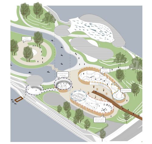 Pour ce faire, nous avons pensé à des activités nautiques de sport et de loisirs, tels que le canoë-kayak et l'aviron. Un parc public paysager viendra assurer la continuité et le prolongement du parc départemental et abritera un parcours d'eau vive. Le parc public viendra renforcer les échanges intercommunaux, et sera pensé comme un équilibre entre le minéral et le végétal de l'île. Il aura pour intention d'être la démonstration des activités locales qui se déroulent sur les lieux et pourra devenir donc une destination de loisirs en plein-air à l'Île Saint Denis.