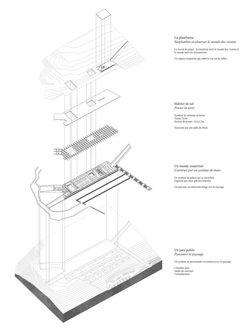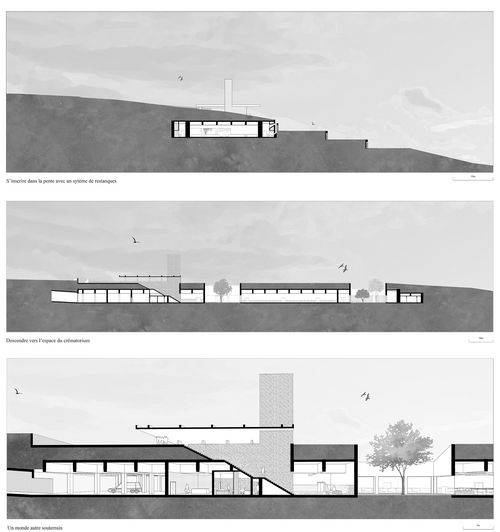Ce projet de fin d'étude suit une phase de recherche sur les représentations de la mort dans l'espace public. L'étude est partie du constat suivant : la mort est de plus en plus rejetée de nos villes et ignorée des aménagements urbains, avec un rapport différent entre les grandes villes et les communes rurales, dépendant de structures sociales et échelles spatiales différentes. Cette étude, appuyée sur une analyse de cas situés (comparaison entre Paris et Blangy-sur-Bresle, commune rurale de la Vallée de la Bresle) a révélé (entre autres) un problème dans la gestion de la mort en commune rurale : le manque d'équipement funéraire oblige de nombreuses familles à renoncer aux vœux de crémation des défunts, ou impose des délais et de longs déplacements, pesants sur le deuil des proches.
