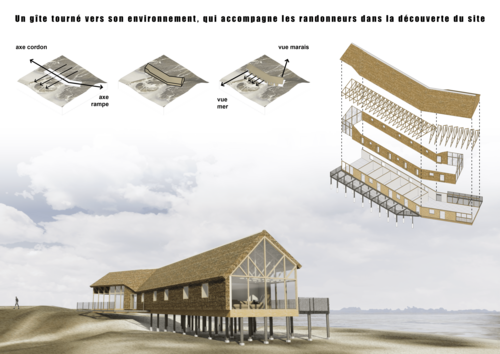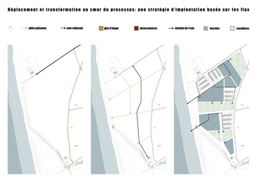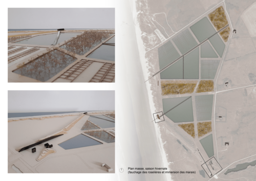 L'objectif est double : proposer de nouveaux processus de production et faire cohabiter les différentes espèces (humaine, animale et végétale). La stratégie consiste à aborder les flux, penser ce processus comme un cycle et questionner les échanges entre les éléments. Pour cela, sont créés des marais salants associés à des roselières ainsi qu'un gîte d'étape. Il s'agit alors de mettre en scène les pratiques humaines et la biodiversité au travers de la marche. Les coques de béton sont réinvesties : la démarche consiste à les mettre en résonance et les faire dialoguer avec le site.