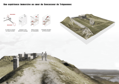En Baie d'Audierne, le long d'un chemin de randonnée, les vestiges du Concasseur de Tréguennec intriguent les promeneurs. Cette usine constituait un site d'exploitation de galets employés pour la construction du Mur de l'Atlantique. Aujourd'hui, ces coques de béton se dressent et s'imposent : elles posent question quant au rapport au paysage. Ce Projet de Fin d'Études tient à se positionner sur cette ancienne usine pour la réactualiser au regard des enjeux actuels.