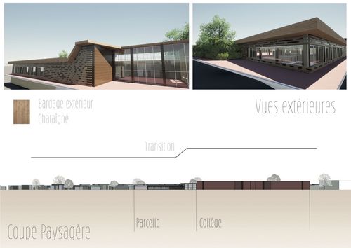 Ce programme permet de donner les premiers réflexes conceptuels pour la réalisation d'équipements publics : image institutionnelle, valeur d'usage (rapport entre locaux avec contraintes dimensionnelles, acoustiques d'éclairement, différentes - intime/public) et les flux (chaussures de ville / de sport). Cet équipement a aussi l'avantage d'associer la conception à la structure (charpente bois et son design - béton...) et d'introduire les notions de conception bioclimatique (rapport au soleil, au vent, aux précipitations) et l'usage des espaces extérieurs. Les liaisons fonctionnelles avec le collège existant sont à déterminées.