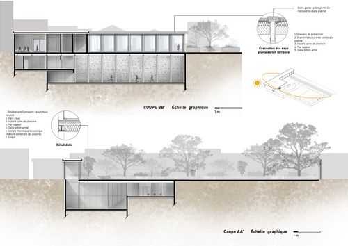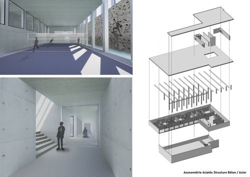 Le projet s'inscrit dans l'une des thématiques retenues pour la 2ème année de licence dans le programme de l'ENSAPV (structure et matière) en s'attachant à un programme sportif sur un terrain existant, avec la volonté d'initier les étudiants à la pratique du projet sous certains de ses aspects opérationnels (méthode de travail, techniques de construction, insertion dans le réel, etc.), c'est à dire de rendre la réalité du construire moteur de la conception et non simple conséquence.
