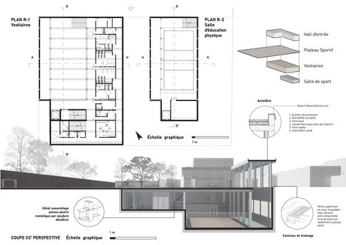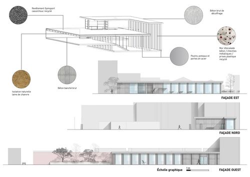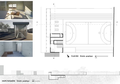 Ce programme permet de donner les premiers réflexes conceptuels pour la réalisation d'équipements publics : image institutionnelle, valeur d'usage (rapport entre locaux avec contraintes dimensionnelles, acoustiques d'éclairement, différentes - intime/public) et les flux (chaussures de ville / de sport). Cet équipement a aussi l'avantage d'associer la conception à la structure (charpente bois et son design - béton...) et d'introduire les notions de conception bioclimatique (rapport au soleil, au vent, aux précipitations) et l'usage des espaces extérieurs. Les liaisons fonctionnelles avec le collège existant sont à déterminées.