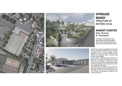 Le projet proposé aux étudiants consiste en la conception d'un gymnase multi sport dans l'enceinte du collège Henri Sellier à Bondy (93), inscrit dans un environnement péri urbain hétérogène.