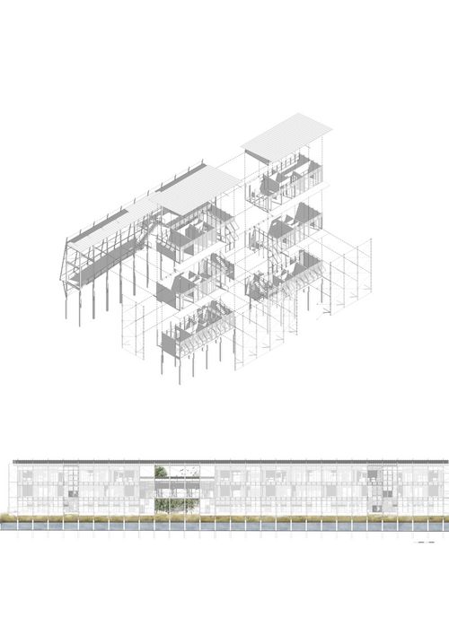 Axonométrie éclatée : déclinaison du logement triplex en duplex surmonté d’un simplex ; Elévation d’un hameau d’habitations