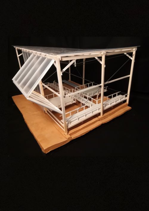 Coupe longitudinale du hangar ostréicole de stockage et magasin-restaurant associé ; coupe de la halle pédagogique piscicole
