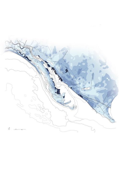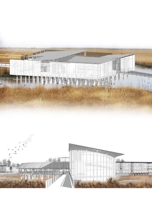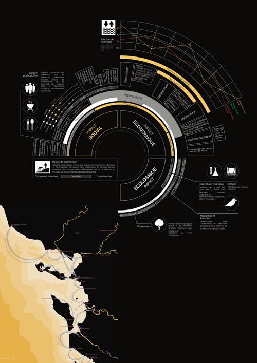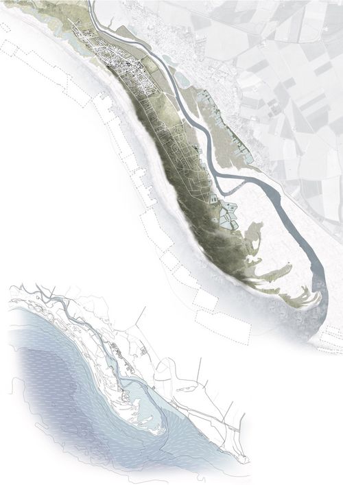 Développé dans un soucis de réinterprétation du modèle social et touristique d'une commune vendéenne du Marais Poitevin, le projet s'appuie sur une résurgence de la zone humide (vasières, prés salés) et des pratiques aquacoles. Il s'inscrit également dans un enjeu de revalorisation des anciens polders agricoles urbanisés et sinistrés par les submersions marines lors de la tempête Xynthia.