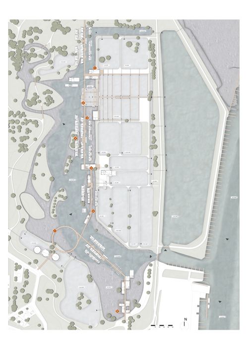 Les usages se déclinent le long d'une passerelle décrivant du même temps une promenade à la fois panoramique et pédagogique sur les enjeux de la production agricole, de la gestion de l'eau et sur la protection du biotope caractérisé par son musée ou sa tour d'observation. En outre, la diversité des productions permet d'enrichir les interactions entre producteur et visiteur au sein d'espaces partagés comme la halle piscicole de reproduction aménagée en espace de travail et de découverte. Enfin, des espaces d'activité permettent de compléter la richesse programmatique du lieu.