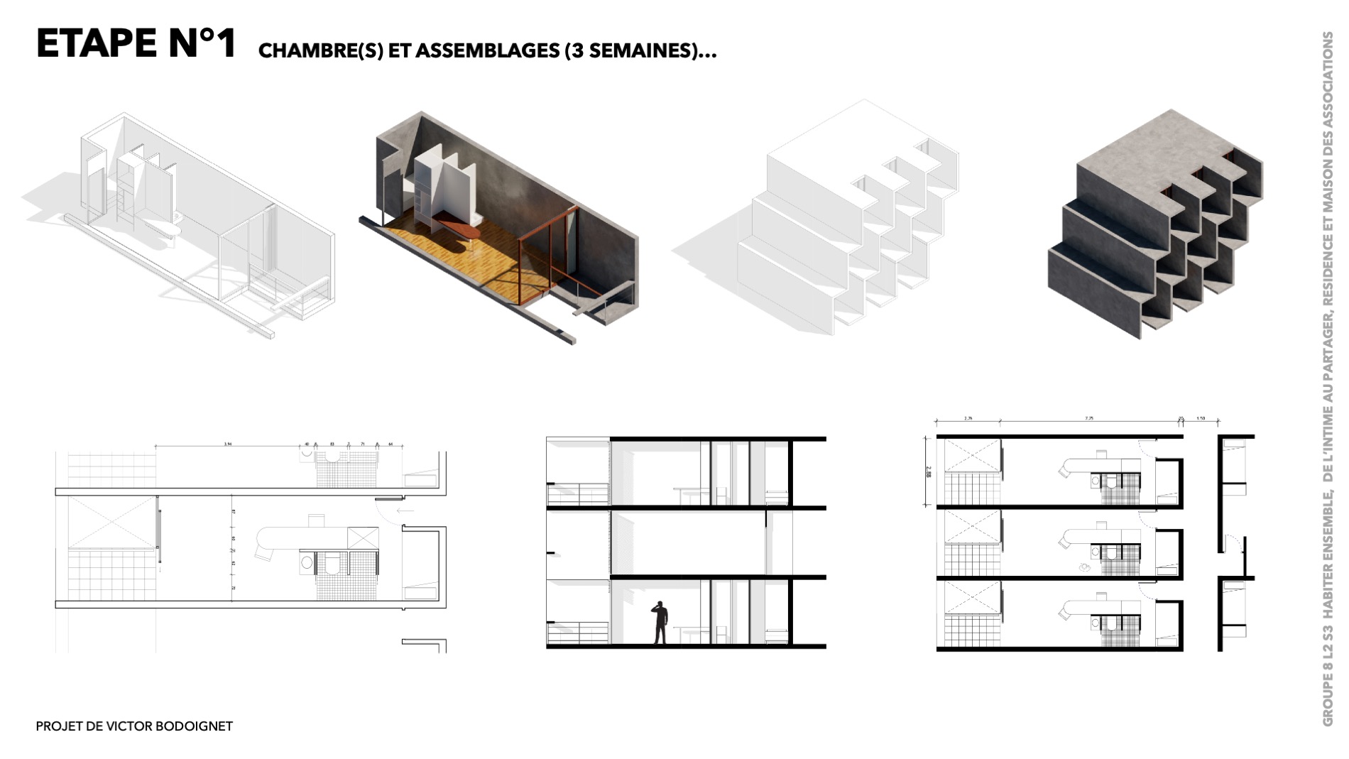 DU PARTICULIER AU GENERAL. Le thème, « l’unité et la répétition », est l’occasion d’un travail sur un immeuble résidentiel : à partir d’une chambre idéale, il s’agit explorer horizontalement et verticalement les potentialités addictives du module initial pour concevoir un édifice dans sa totalité, depuis le sol jusqu’au ciel en partant de l’intérieur…