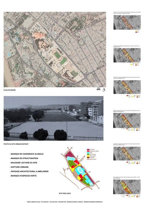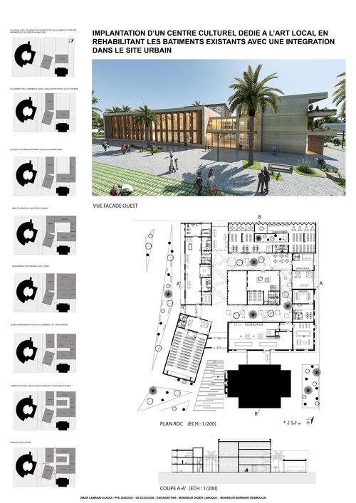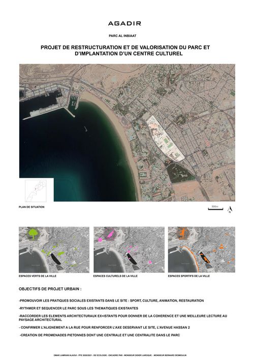 Ce projet de fin d'études portera sur la restructuration et l'aménagement du parc Ibniaat situé au Maroc à Agadir. Ce parc est délaissé et se présente comme une rupture urbaine et un " trou dans la ville " et est donc un sujet quant à la stratégie urbaine du Maroc. En effet, ce projet s'inscrit dans cette stratégie de modernisation de la part du Maroc, dictée par une volonté de réhabiliter les parcs existants et d'aménager différents espaces verts ainsi que de promouvoir la culture locale. J'envisage d'implanter dans ce parc, un projet de centre culturel doté d'un pôle artistique qui participe au renforcement du faible nombre d'équipements de la ville d'Agadir.