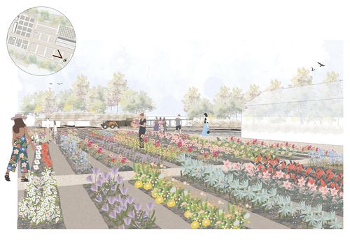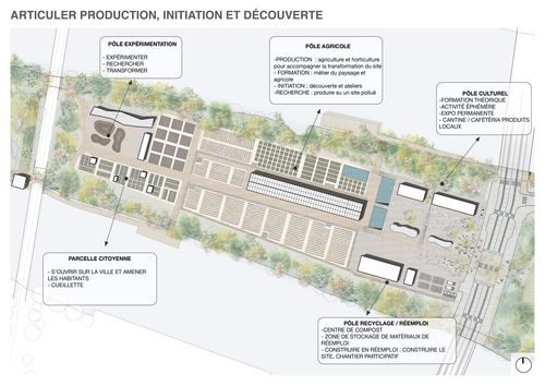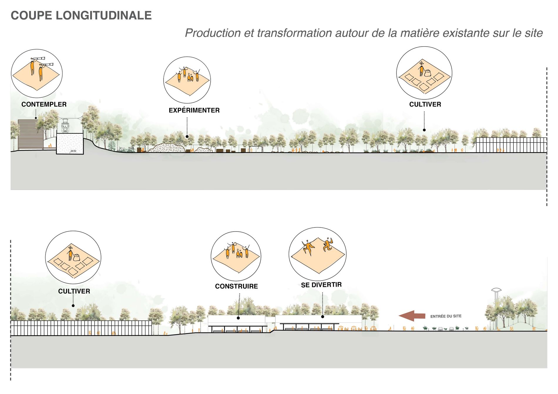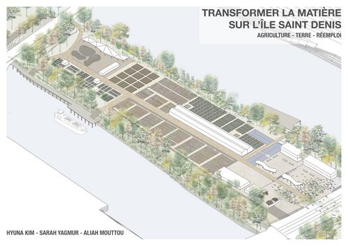 L'objectif est de transformer la matière sur l'Ile-Saint-Denis à travers l'agriculture, la terre ainsi que le réemploi. Grâce à son programme mixte, cette parcelle permet d'articuler la production, l'initiation et la découverte à travers de nombreuses activités (cultiver, expérimenter, contempler, se divertir, construire etc.) Le but est de produire et de transformer le site par le biais des matériaux existants non seulement sur le site (terre, bloc de pierre, planche de bois...) mais aussi sur l'Ile-Saint-Denis (chantier des JO, port de Genevilliers...).