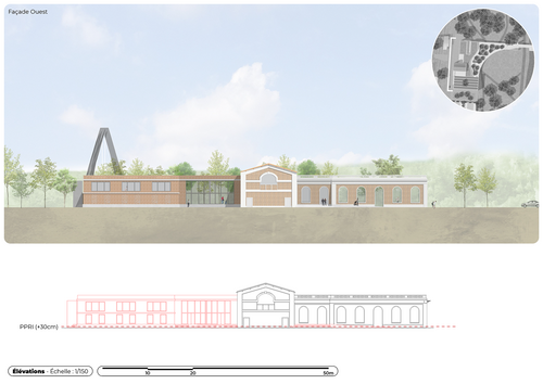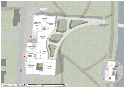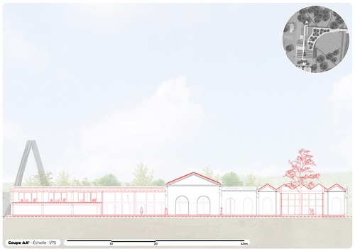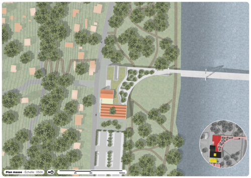 Les bâtiments, en assez bon état, accueilleront une médiathèque afin de pallier au manque d'équipement culturel des environs, ainsi qu'un restaurant pouvant profiter de la végétation de la parcelle. L'ensemble du projet est lié par un belvédère, connectant l'ancien, le neuf, le projet architectural et urbain.