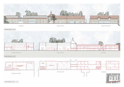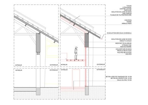 L’aspect, la forme et la matérialité des bâtiments construits est identique aux bâtiments existants en raison de garder l’homogénéité dans le projet, sauf qu’une intervention au niveau des toitures, permet une meilleure gestion des espaces ainsi qu’une intégration de la lumière aux espaces tampon et de circulation.