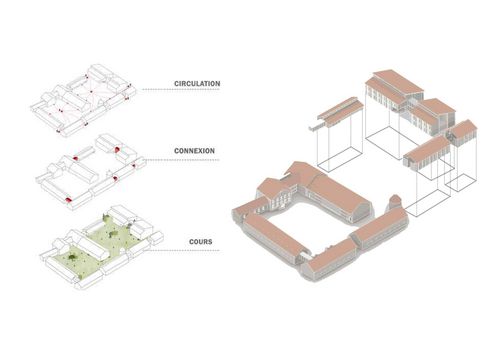 Le concept de fortifications se développe avec l’idée d’offrir une visibilité sur la ville tout en protégeant les malades en situation délicates, à l’aide de jardin entre les bâtiments et plus précisément les 2 cours centrales autour desquelles tourne le projet.