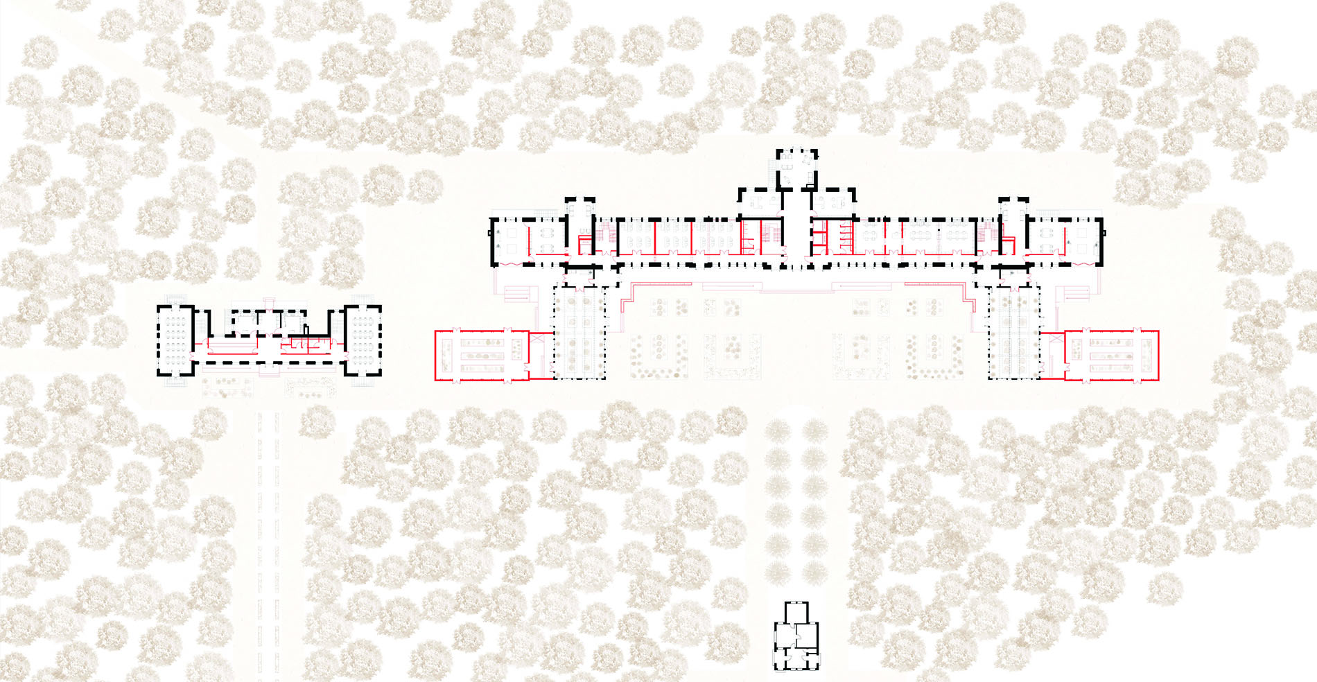 Le premier acte de projet se fait à l'échelle du site. Des stratégies localisées sont déterminées afin de réintégrer les trois édifices du préventorium dans leur territoire et dans leur paysage.