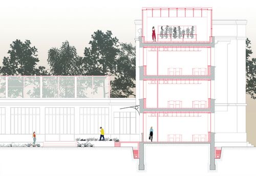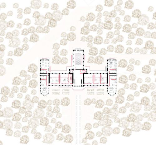 Dans le cadre de l'école d'horticulture, des serres sont créées : dans les anciens préaux du préventorium, en extension de ces préaux et sur la totalité du toit, en surélévation. Ces serres deviennent le lieu de contemplation de la forêt, lien entre matériel et immatériel, entre le bois et le bâti existant.