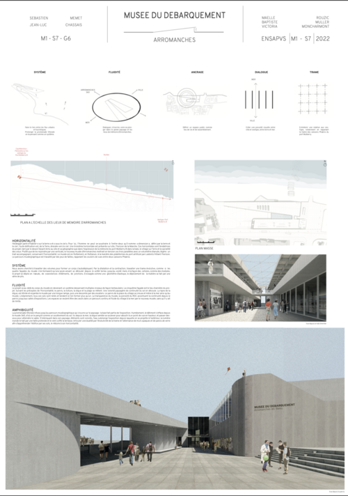 Heidegger parle d’habiter « sur la terre » et « sous le ciel ». Pour lui, l’Homme ne peut se soustraire à l’entre-deux qu’il nomme « dimension », défini par la terre et le ciel ; toute édification est, de la Terre, dressée vers le ciel. Une troisième horizontale est présente sur site, l’horizon de la Manche. Ces horizontales sont fondatrices du projet, tant par le dessin faisant écho au site et sa géographie que dans l’expression de la mémoire du port Mulberry B dans la baie, le village sur Terre et la sacralité des cieux. Plutôt que de les rejoindre par une verticale, le nouveau musée d’Arromanches mettrait en tension ces trois parallèles avec un volumétrie élancée, légère : un trait accompagnant, conservant l’horizontalité. Le musée est en flottement, en flottaison, à la manière des plateformes du port artificiel par Loebnitz frôlant l’horizon. Le parcours muséographique est travaillé par des jeux de failles, rappelant les couloirs de vues entre deux caissons Phœnix.