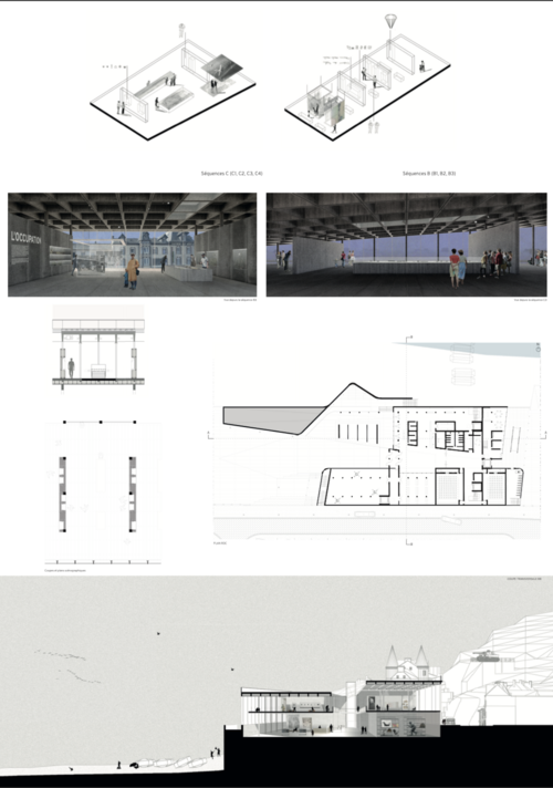 Le projet va au-delà du corps du musée en devenant un système desservant multiples niveaux de façon tentaculaire. La cinquième façade est le lieu charnière du pro- jet. Suivant les préceptes de l’horizontalité, le parvis, la toiture, la digue et la plage se mêlent. Une volonté paysagère de continuité du sol en découle. La ligne de la digue, est étirée et enjambe le musée par une longue rampe, puis une descente par des escaliers. Le parvis de la place du village se creuse et mène à la mer ainsi qu’au musée. Linéairement, tous ces sols sont reliés et tendent à n’en former plus qu’un. La transparence du musée, la porosité du RDC accentuent la continuité depuis le parvis jusqu’aux salles d’expositions. Les espaces se veulent être des seuils dans un parcours continu et fluide du village à la mer par le nouveau musée, sans qu’il y ait de limite.
