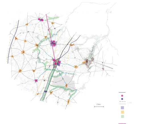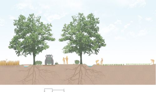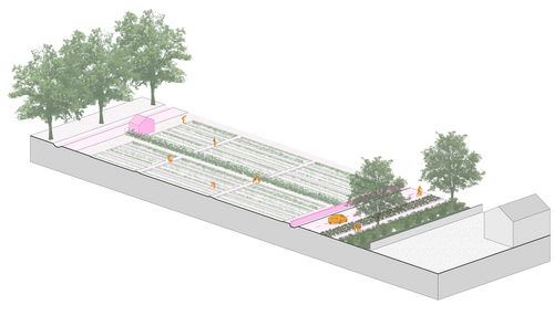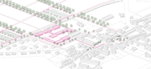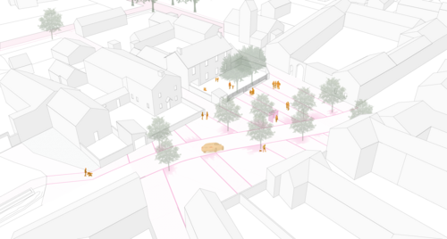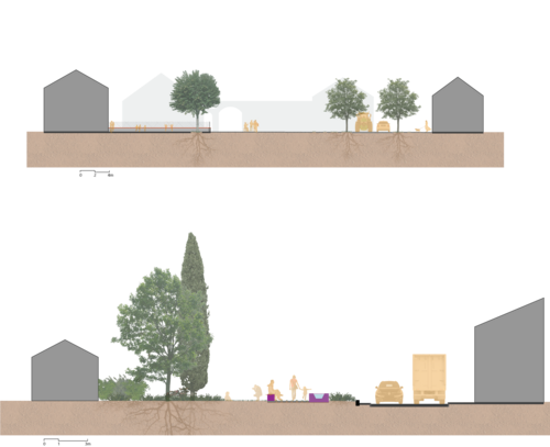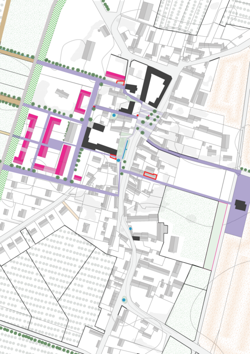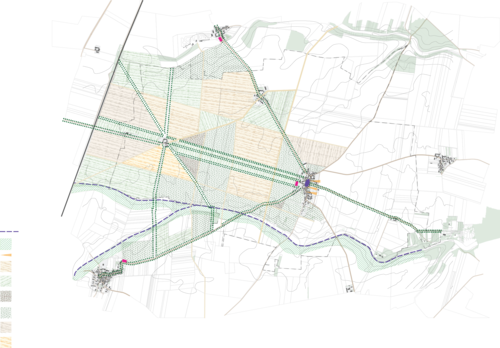 Ces changements de pratiques agricole et la nouvelle population offre l'opportunité et les moyens à la commune de requalifier ses espaces publics. Par un travail de lisière, de la porosité et des liens apparaissent entre l'espace bâti et les champs. Le projet propose ainsi, à travers la création d'un grand paysage commun, d'habiter autrement en milieu rural. Pour cela, trois secteurs ont permis d'illustrer ces transformations : le point de départ du parc agricole et deux espaces publics au cœur du bourg.