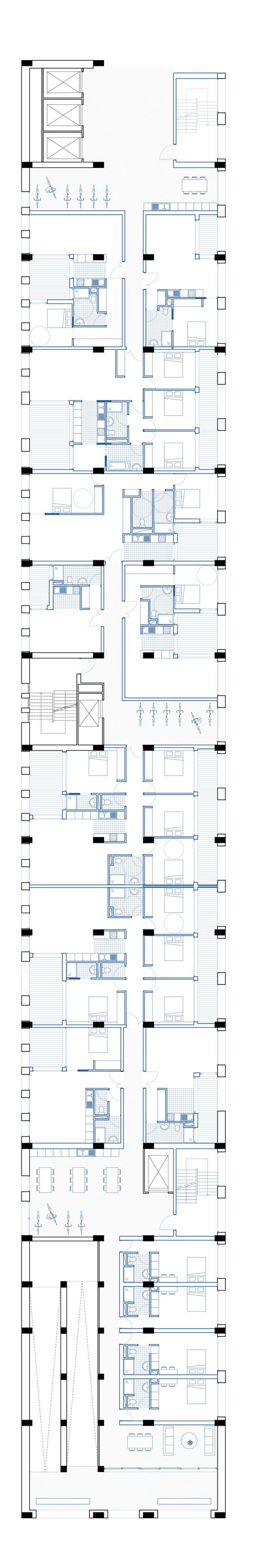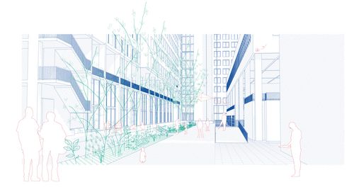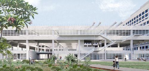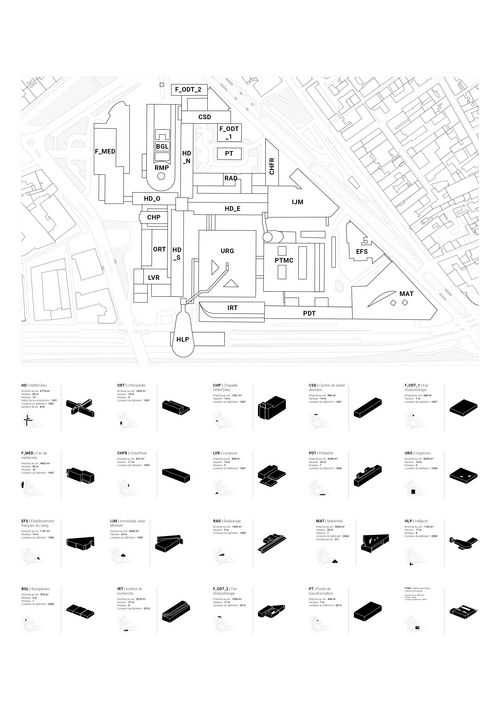Suite au déménagement du CHU, nous proposons d'ouvrir les 9 hectares bâtis à la ville. L'intervention urbaine se concentre principalement sur l'irrigation du site, sa piétonnisation et la redéfinition des relations entre les interfaces du site avec ses alentours. Nous souhaitons rendre l'îlot plus perméable, mettre en place de nouveaux parcours et traversées. Il est question de redéfinir et redessiner les espaces publics, de les spécifier en fonction de leur localisation et de favoriser leur accessibilité.