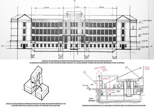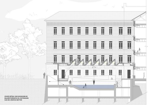 Le développement architectural du projet s'est articulé autour d'un édifice particulier, implanté stratégiquement sur la parcelle, dans l'axe de l'entrée principale actuelle, qui se nomme Netter. L'intervention consiste principalement en l'installation d'une extension entre les ailes du bâtiment s'avançant vers le sud, destinée à recevoir un accueil et deux bassins de balnéothérapie différenciés.