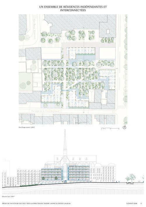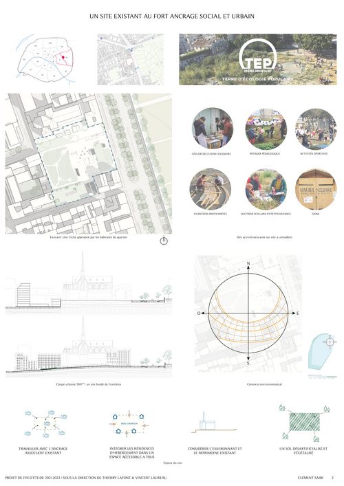 Le lieu d'hébergement est prévu afin de répondre au mieux à leurs besoins, ou ''non-besoins'' et de leur donner la possibilité de profiter d'un éventail d'activités et d'opportunités pour une insertion dans un cadre urbain choisi agréable et propice. Paris et les départements limitrophes m'ont semblé être des lieux de recherche à investiguer face à l'importante demande en Île-de-France. L'objectif a été de choisir un terrain/lieu d'implantation à l'ancrage social fort, et propice à ce programme : L'ancien Terrain d'Education physique (TEP) de Ménilmontant.