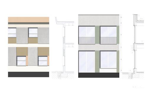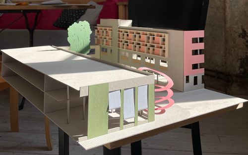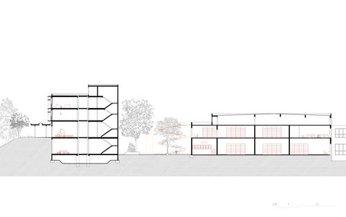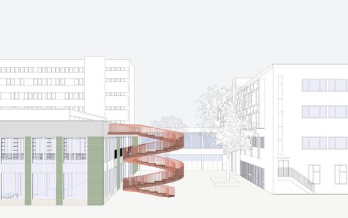 La particularité du projet est que toute la structure du bâtiment existant est conservée, tout comme la façade historique des années 70 du bâtiment de la Maternité. Le bâtiment arrière plat reçoit une nouvelle façade dont la matérialité s'inspire de l'ancien original des années 70 grâce à un revêtement partiel en carreaux de céramique, mais avec des ouvertures plus grandes.