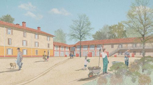 LA COUR HISTORIQUE, SUPPORT DES ACTIVITÉS PRODUCTIVES ET SOCIALES: La cour est fermée sur rue par un mur d’enceinte en brique rouge et sur le parc par le front bâti. Ainsi les usages productifs sont garantis et sécurisés. Le sol n’est pas minéralisé pour