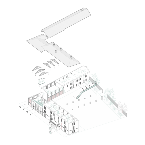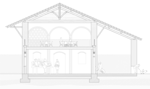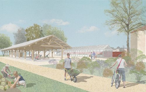 LA COUR SECONDAIRE, SUPPORT DES ACTIVITÉS DU PARC AGRICOLE URBAIN : L’auvent, reprenant la typologie structurelle de la halle, est dédié aux utilisateurs du complexe et du parc agricole urbain. La serre prend appui sur un mur d’enceinte en brique rouge le
