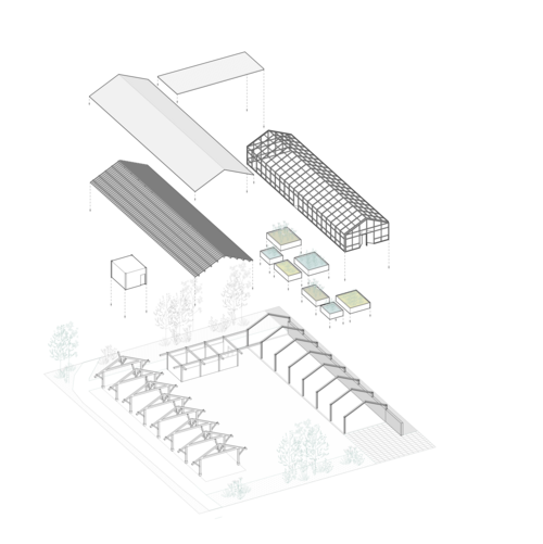 UNE TRAME STRUCTURELLE INSPIRÉE DES «RUSTICI» EXISTANTS : L’auvent agricole reprend le schéma structurel de l’étable historique, notamment par l’expression d’une charpente en bois similaire, cependant cette dernière s’appuie sur des poteaux bois. La serre