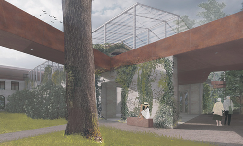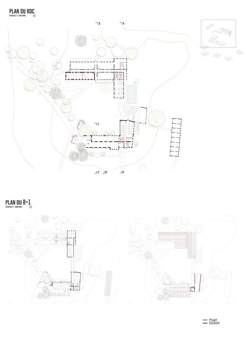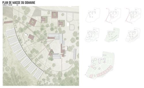 Mon programme tournerait autour d'une production maraîchère qui exploiterait les terres ensoleillées des coteaux. Elle permettrait d'approvisionner un restaurant et un primeur. Les randonneurs aux abords du site pourraient s'arrêter, visiter, se restaurer, et y passer la nuit. La production ferait vivre un écosystème sous la forme de tiers-lieu. Des logements en coopérative permettraient à des personnes isolées de vivre à proximité d'un lieu convivial, où ils pourraient s'investir. Le lieu pourrait également être réservé pour des événements comme des mariages et marchés. J'ai voulu connecter les deux époques architecturales existantes entre elles, et signaler mon intervention par une nouvelle temporalité qui soit lisible : l'acier corten. Pour sublimer la ruine, j'ai créé une passerelle générant un parcours suspendu, menant à des extensions réhabilitées. Un toit en vantelles de verre fait office de parapluie transparent au-dessus de cette promenade.