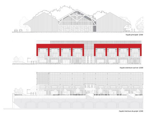La halle inférieure se compose d'une série de six tunnels en pierre, le projet fonctionne sur une logique de stratification : une première strate dans la halle inférieure au niveau du quai de seine avec le stockage déjà existant des matières premières, une deuxième dans la halle supérieure au niveau du parc avec des ateliers et des commerces alimentés par le stockage sous leur pieds et enfin deux étages de logements modulaires qui peuvent accueillir jusqu'à 288 personnes.