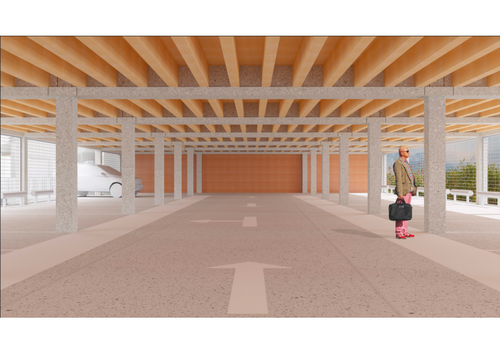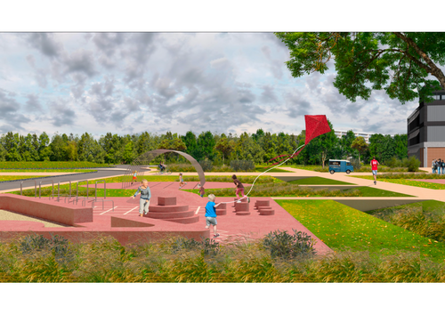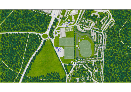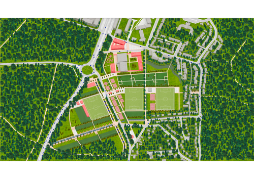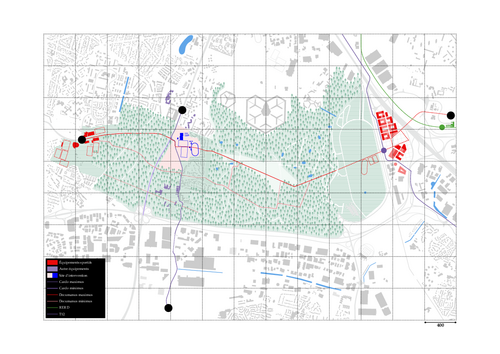 Ce morceau de ville composé d'un complexe sportif issu de la juxtaposition de différentes surfaces imperméables et d'une plaine couverte de terres polluées, devient un nouveau moment central au coeur de la forêt.